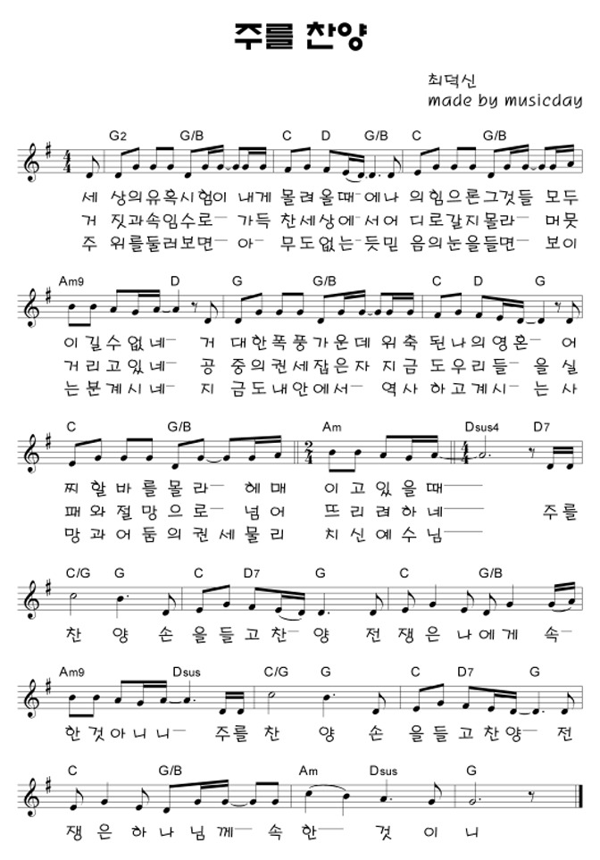 세상의 유혹 시험이 마커스 듣기 악보 가사 g 코드 세상의 유혹 시험이 내게 몰려올때에 나의 힘으론 그것들 모두 이길수 없네 거대한 폭풍 가운데 위축된 나의 영혼 어찌할 바를 몰라 헤메이고 있을 때 주를. 어찌할 바를 몰라 헤매이고 있을때. 어찌할바를 몰라 헤매이고 있을 때. 나의 힘으론 그것들 모두 이길 수 없네.