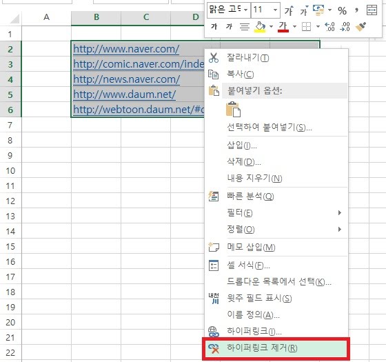 Excel 엑셀 하이퍼링크 일괄삭제 하기 어제 오늘 내일